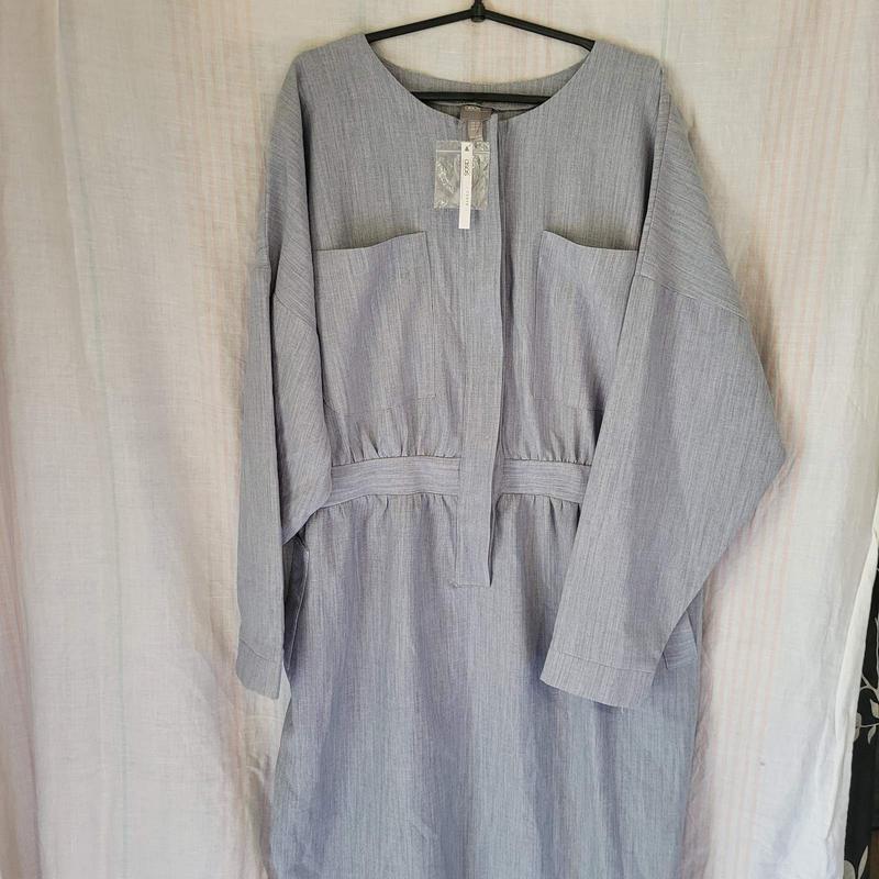 Длинное платье, рукав летучая мышь, плечо спущено, на груди два кармана. Потайная планка, талия на широком поясе, сзади шлица. Серое. Ог 130+-, талия 112. Об 146, рукав от ворота 80, длина 125.