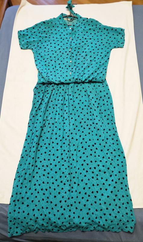 Сукня з талією на випуск, або приспущена талія, приховує недоліки фігури. Колір малахіт, з сердечками, тканина бавовна, ПОГ 52, ПОТ 38+10, ПОБ 56,