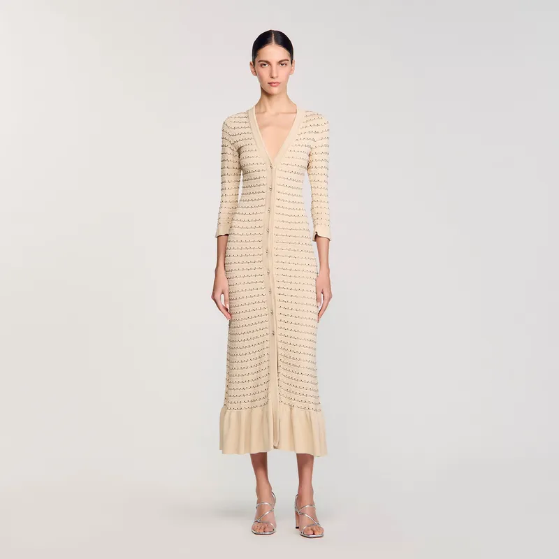Перед оформленням замовлення, будь-ласка, напишіть у чат свій розмір 😍❤️👌🌹 ✅ Оригінал із цінником. Трикотажна сукня Sandro максі зі стразами, глибоким вирізом, застібкою на ґудзиках та рюшами. Під замовлення доступна така сама модель у білому кольорі. Особливості: -Жіноча в'язана сукня максі Sandro -Декоративні стрази -V-подібний виріз -Застібка на декоративних ґудзиках -Рукава довжиною 3/4 Ціна на сайті виробника: 267€ Ref: SFPRO04243 SIZE: S / M / L Main fabric: 52% viscose, 46% polyamide, 2% elastano ✔️Повернення можливе.