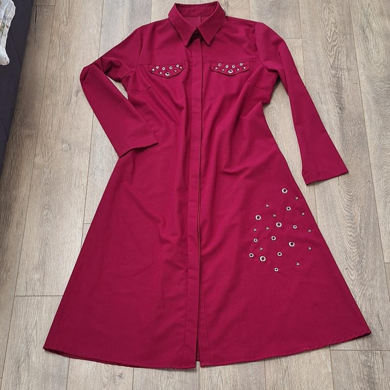 Нове плаття без нюансів у вільному стилі в холодному малиновому кольорі. Кишені немає, ґудзики від верху до низу потаємні (на фото), можна робити комір-стійку. Плечи 40см Довжина рукава 60 см Довжина 110 см Напівобхват грудей 50 см Напівобхват талії 48 см Напівобхват стегон 56 см і йде вниз розкльошене. Зникнуть питання — пишіть