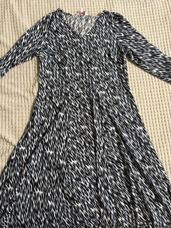 Сукня з з абстрактним анімалістичним принтом у чорнo-білих тонах. V-подібний виріз, довгий рукав, розкльошений низ. Добре підходить на високий зріст, можна й підшити під потрібну довжину.