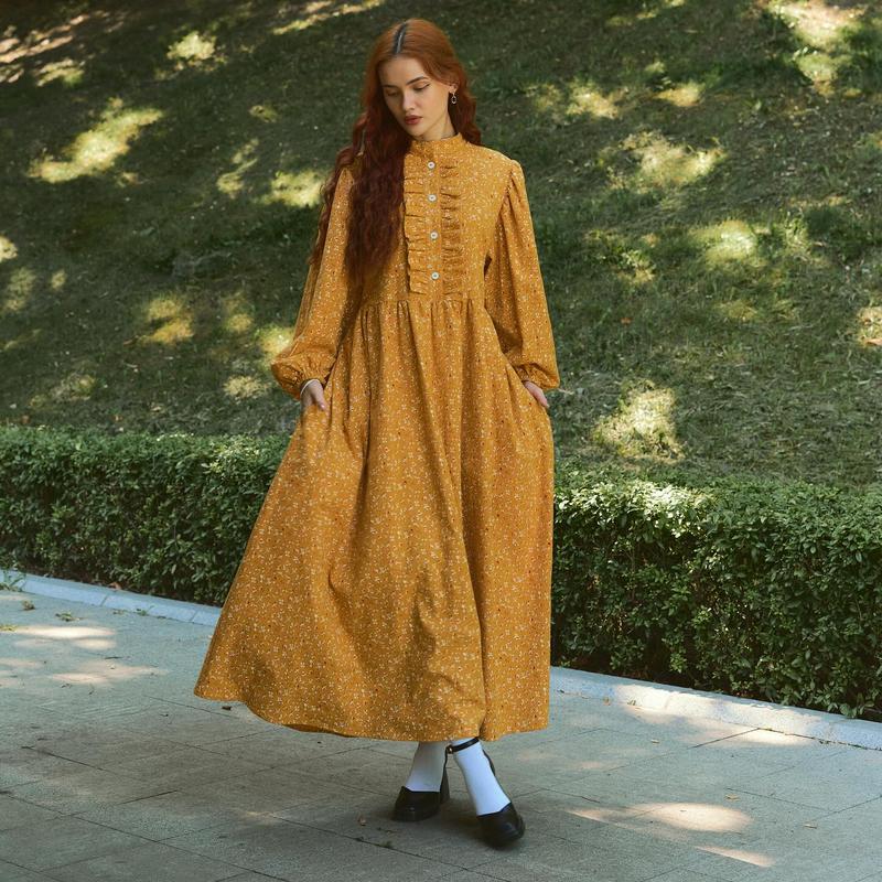 ⚡️Гірчична сукня вільного крою з дрібним квітковим принтом, довгим рукавом, високим коміром-стійкою та рюшами⚡️ Ця довга сукня з фланелі у вінтажному стилі в міру тепла, тому підходить на сезон осінь-весна. Модель з гарним жабо на гудзиках спереду, довгими рукавами-ліхтариками на манжеті з резинкою і пояском на талії, який дає можливість її красиво підкреслити. Вінтажна сукня з квітковим принтом чудово поєднується з мінімалістичними аксесуарами та нейтральними туфлями. ▪️Матеріал: 100% фланель ▪️Колір: гірчичний, жовтий ▪️Розмір: 42-46 За бажанням можливе пошиття в іншому кольорі, будь-якому розмірі та довжині!