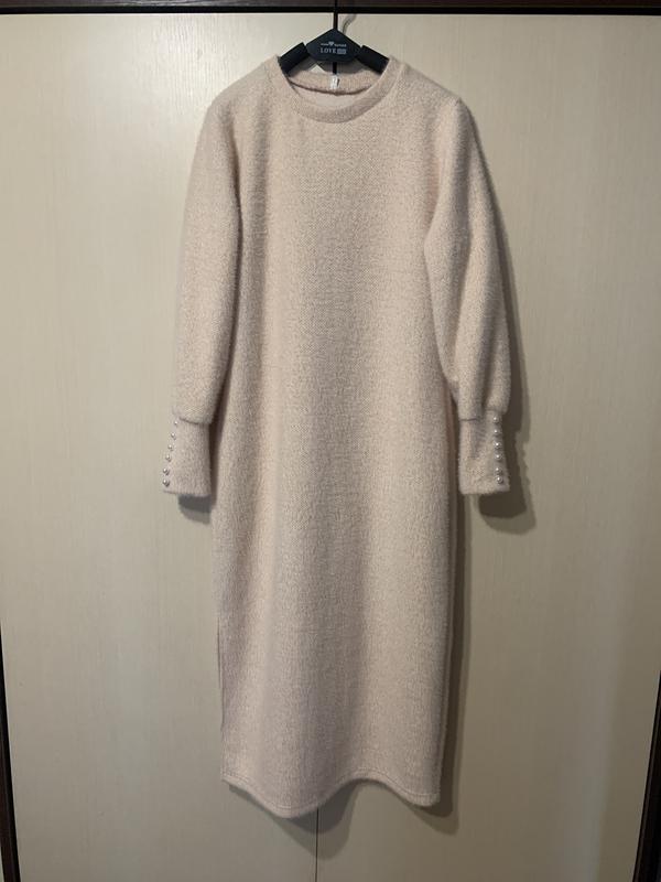 Довжина 115 см, рукав 57 см, ПОГ 47 см, ПОБ 54 см, з одного боку розріз, на рукавах пробиті перлинки , сукня тепленька, тканина мʼякенька , приємна до тіла, одягалась один раз, майже нова