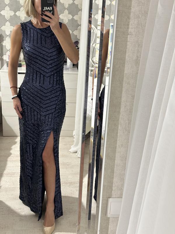 Вишукана сукня максі в темно-синьому кольорі від Quiz. Повністю на підкладі. Тягнеться. Розмір вказаний 12 Ідеально підійде на повномірний S/M. Стан нової речі