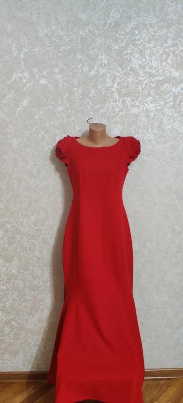 Плаття довге,вечірнє,червоного кольору(на фото колір яскравий, насправді колір більш темний червоний).Дуже гарно лягає по фігурі,тканина приємна до тіла,гарно падає,матеріал не знаю який,може більше шифон.Рюши на плечах надзвичайно прикрашають плаття.Одягала два рази.Пареться добре,прасується легко. Розмір 42.В плечах 40см,в грудях 46,талія 42, в бедрах 54,довжина 142