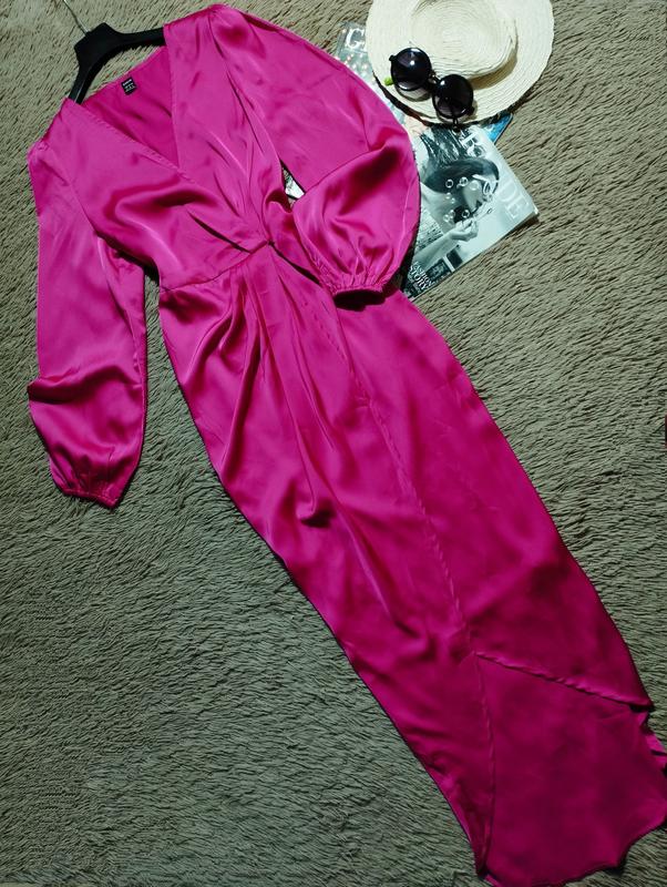 В ідеальному стані. Шикарна довга асиметрична сукня з об'ємними рукавами. Тканина легка, шовковиста на дотик, не тягнеться. Виглядає супер 😍 Розмір 10/38/М, але дивіться по замірам Заміри (напівобхват): Груди 51 Талія 35(тягнеться до 47)-(ззаду резинка) Стегна 55 Рукав 63 Довжина від плеча спереду 100/ззаду 140