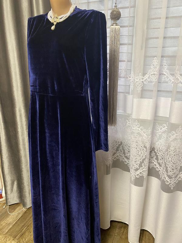 Неймовірно гарне плаття темний океан. Велюр щільний. На розмір М-Л. По фігурі сидить бездоганно. Стройнить. Все просто ідеально. Рекомендую.