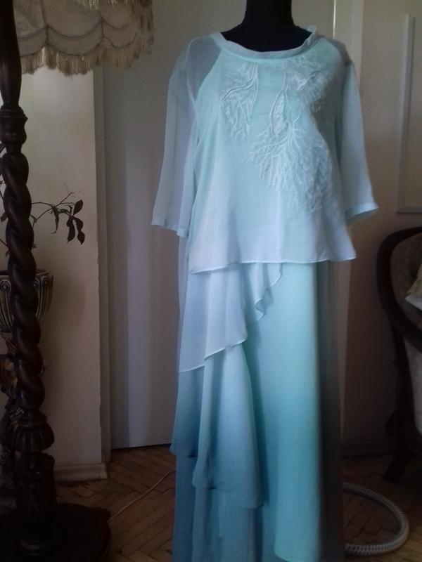 Дуже красиве нарядне плаття Floryday.кольори тіффані..з переходами від світлого до темніше..Розмір вказаний Л. довжина 127см.по боках трохи довше.на Ог 95..98см.сукня не в обтяжку-стегна і талія більш вільно.Думаю залишитеся задоволені покупкою
