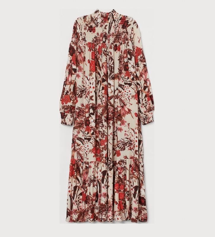 Плаття в стилі casual, вільного силуету, завдовжки до ікри з віскозної тканини з набивним малюнком. На платті комір-стійка та кокетка з вафельною складкою. Довгі широкі рукави з вафельною гумкою знизу. Відрізний низ із широким воланом. Без підкладки. Плаття з натуральної тканини. Легке, добре дихає. Матеріал: Віскоза / Склад тканини: 100% Віскоза Розмір вказаний - 42 / український: 48/50/52 ( Л/ХЛ/2ХЛ) На бірці вказано розмір - 42 / український - 48/50/52 Підійде на розмір - Л/XL/2 ХЛ ЗАМІРИ: Пог - від 60 см ( у вільному стані ) до 73 см. Верх вільний спадаючий до низу, за рахунок фасону. Поб - до 90 см ( вільно спадає ) Ширина спинки - 34-38 см Довжина рукава - 65 см ( регулюється манжетом на резинці ) Довжина сукні - 135 см