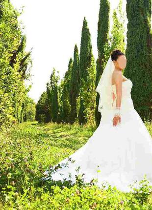 Весільну сукню у відмінному стані, колір айворі, з шлейфом (подкалывается на приховану гудзик). Після хімчистки. Корсет і шлейф розшиті дорогим мереживом. Розмір 42-44. Можу вислати додаткові фотографії. Можливий торг