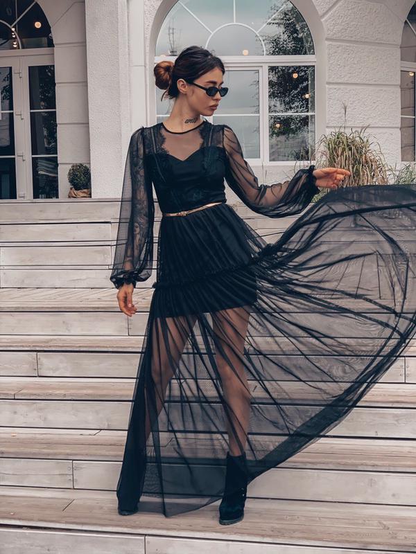 Чорне плаття плаття з Італійської стрейч сітки і бавовняної підкладкою (сітки пішло 4,5 метра). По переду французьке мереживо. Довжина рукава 65 см Довжина спідниці (підкладка) 45 см Довжина спідниці (основний) від талії 115 см Довжина виробу від плеча 160 см Спідниця в два яруси Розмір залишився тільки: S (ОГ 84-88, ВІД 66-70, ПРО 90-94) Ціна 999 грн (замість 4100) Без пояса