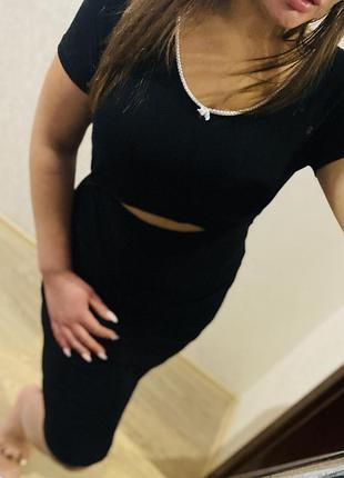 Чёрное платье с прорезом под грудью смотрится как костюм юбка с топом прямого пошива Было в носке без дефектов Размер L 46-48