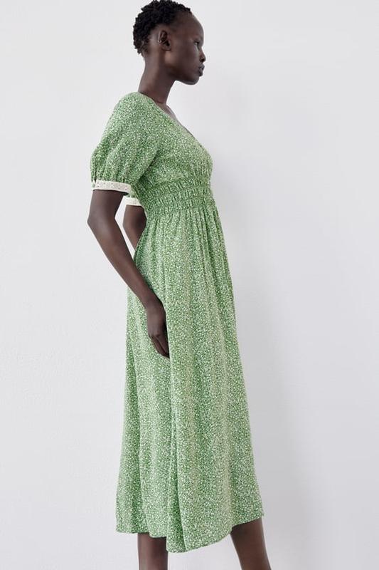 Платье миди с V-образным вырезом и короткими рукавами. Застежка на обтянутые той же тканью пуговицы. Размер S ЗЕЛЕНЫЙ / ЦВЕТ НЕБЕЛЕНОГО ПОЛОТНА 100% ВИСКОЗА