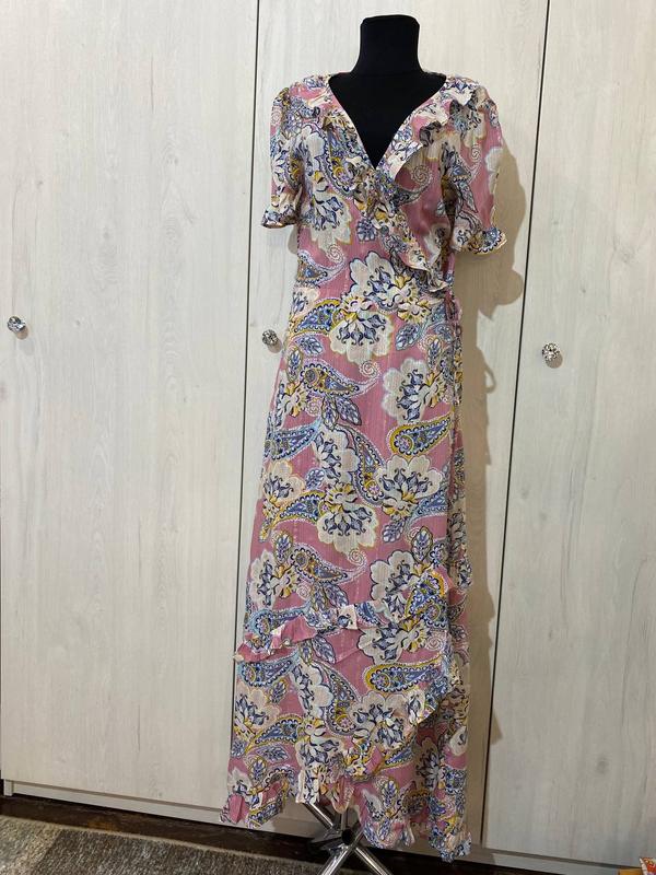 Літнє Платтячко, грайливе, фасон - на запах. Стан чудовий! Склад тканини модал і віскоза. Розмір 38. По грудях приблизно 42, по талії 36, довжина ззаду 138.