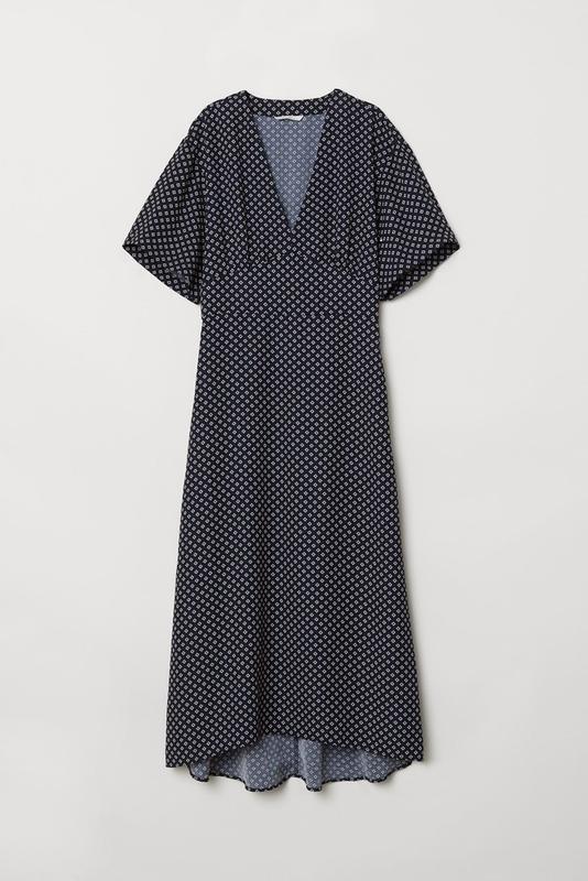 Сукня з трикутним вирізом з тканого матеріалу з заниженою лінією плечей і короткими, широкими рукавами. Відрізна по талії, приталений ліф і округлений нижній край. Подовжена Спинка. Без підкладки. Склад Поліестер 100% Розмір 32 ВИМІРИ Напівобхват груди_38 Напівобхват плеч_ 40 ЗА талии_29 ЗА бедер_50 Довжина изделия_114/117 Товар новий сток, але є шлюб на останньому фото видно,біля блискавки разошео=вся шов, можна зашити. Ціну знизила.