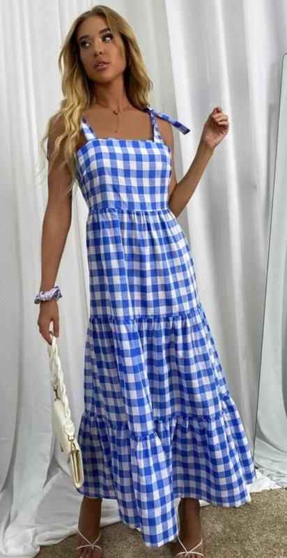 Бавовняний сарафан у блакитно - білу клітинку на засмагле тіло👍😍Довгий, бретелі що регулюються. Розмір с,м