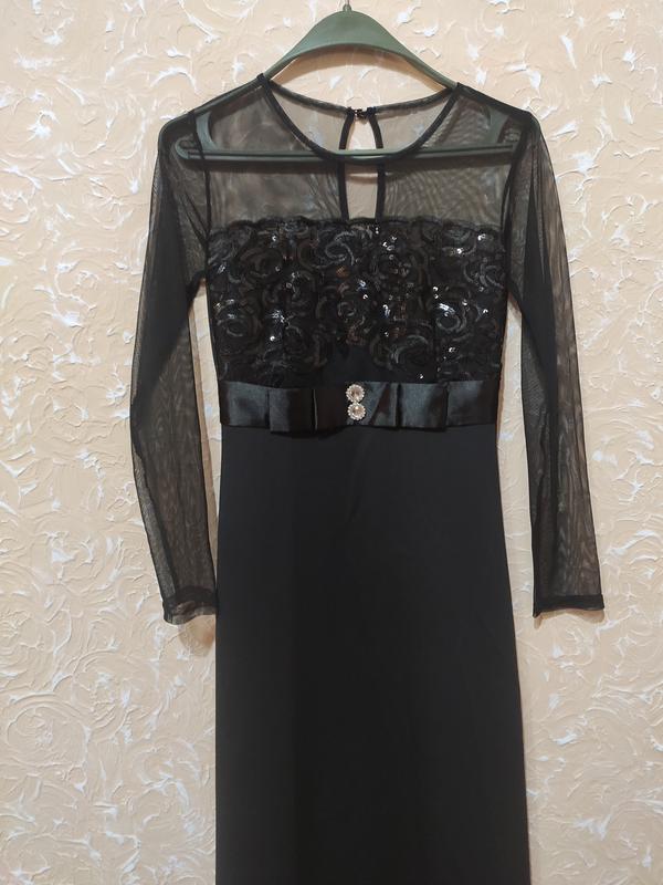 Плаття чорного кольору з паєтками 🌺 Розмір S, М🌺 Довга сукня гарно облягає фігуру, без розрізу. На грудях оздоблена паєтками, атласним поясом та камінням. Плечі та рукава з сітки, на спині є гудзик🌺