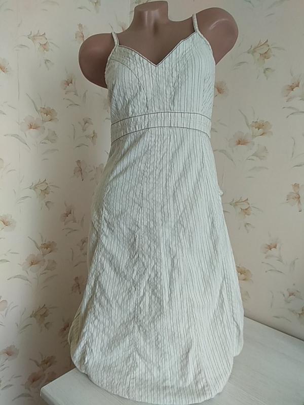 Платье-футляр известного бренда. Ткань натуральная, качественная. Хлопок 95%, , благодаря наличию в составе полиэстер 5% ткань не мнется. В мелкую продольную полоску, что позволяет подчеркнуть все достоинства фигуры. ПОГ-ПОТ-ПОБ 44-40-50. Длина от плеча 105 см. По спинке на замке, прекрасно ложится. Снизу затягивается шнурками. Бретели регулируются. Можно носить без бюстгальтера благодаря фигурным вытачкам. Смотрится очень стильно, эффектно и женственно. Состояние идеальное. Следы носки отсутствуют. Дефектов нет.