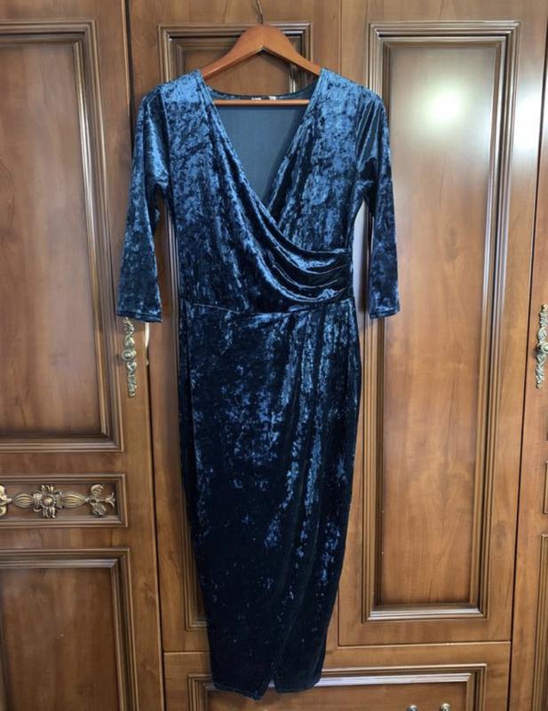 Сукня з мармурового бархату смарагдового кольору, на запах, довжини міді. Рукав 3/4. Тканина стрейч. Колір смарагдовий. В наявності лодочки по кольору. Розмір - 46/48 Пот - 38 см у вільному стані ( тягнеться ) Поб - 48 см ( тягнеться ) Довжина сукні - 131 см Довжина рукава - 43 см