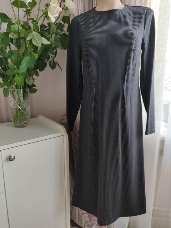 Сукня А-сілуету в новом стані Чорне в тонесеньку смужку Тканина костюмна дуже якісна .Пошив супер! Доброна річ Довжина 110 Пог 44-48 за рахунок спандексу в складі тканини тягнеться Пот 44+ Поб 49 Плечі 37 позаду застібка на гудзику Рукав 60