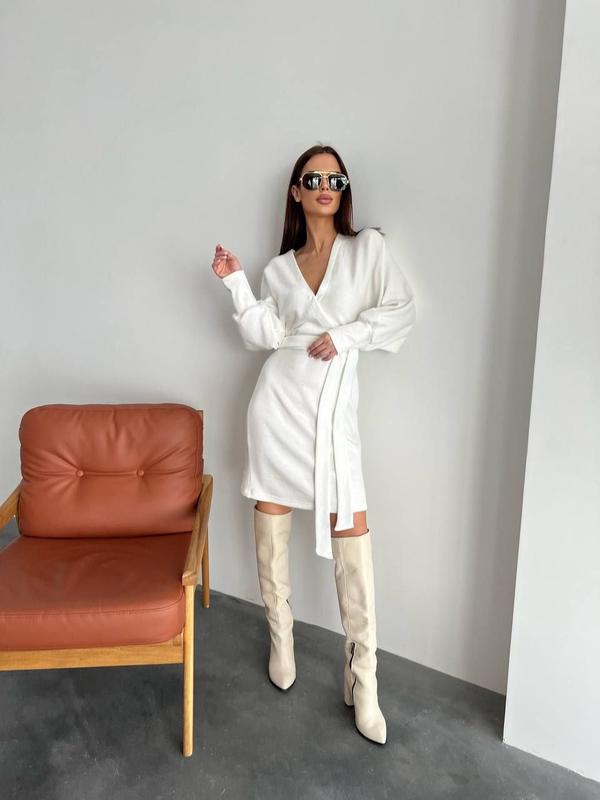 Модель 8422 Розмір 42(S),44(M),46(L) Ціна:920 грн Тканина: Двостороння Ангора Приталена сукня з Ангори з вирізом на запах. Тканина приємна до тіла добре тягнеться. Широкі об'ємні рукави на манжеті. Талія ефектно підкреслена поясом Колір: молочний, сірий, беж.