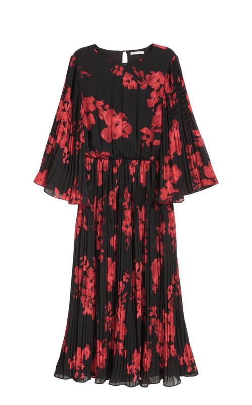 Плаття довжиною до ікри з шифону з малюнком, з отвором ззаду на шиї і плісированими рукавами. Вузький еластичний шов на талії і расклешенная плісирована спідниця. Підкладка.