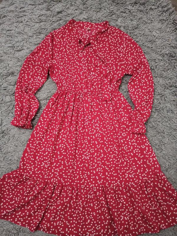 Сукня червоного кольору в білих сердечках,легка,приємна на дотик ,дуже романтична , підійде під кеди та лодочки чи балетки) на рукавах внизу резиночка,на талії теж резиночка ,горловина стоїчка з зав'язками , одягалась один раз ,без дефектів і нюансів Ог 48 От 31 (в нерозтягненому стані) Довжина 101 від плеча до лінії талії 38 Довжина рукава 54 Ширина рукава вгорі 36