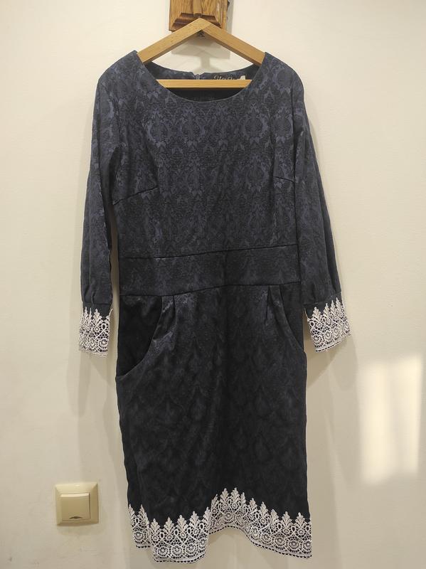 Плаття жіноче дуже гарної якості. Цупке та з напилення ошатного ажуру. Має довжину від плеча 90см. Обхват грудей 86 см. Талія 76см. Бедра 96. А точніше розмір 46-48. Добре тягнеться що дає можливість гарно виглядати по фігурі.