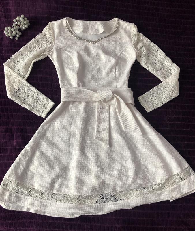 Дуже красиве,ніжне і ошатна сукня,біла, з золотистим відливом!Розмір ХС,заміри є на фото.На тілі сидить дуже красиво,було одягнене 2-3 рази.Зроблено дуже акуратно і якісно!Форнитура до сукні пришита.Дефектів ніяких немає,стан нового!