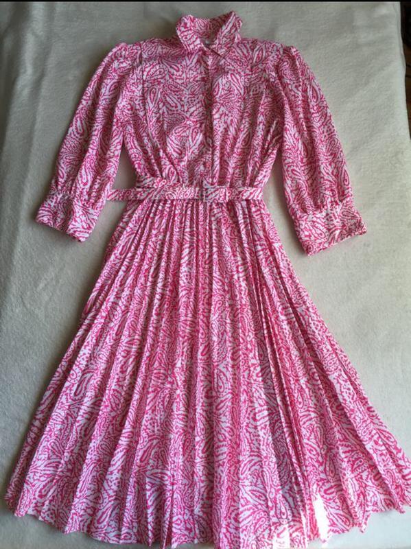 Винтажное платье made in England. Отрезнное до талии, юбка плиссе. Рукава три четверти. Очень красиво и женственно смотрится в одетом виде! Состояние как новой вещи! цена без торга. Длина-114 Пог- максимум -53, можно и меньше. У меня ОГ-93 и тоже, очень хорошо смотрится! Талия на резинке. ОБ любой, так как юбка расклешенная плиссе! Плечи-40 Длина рукава-50 Спереди застегивается на кросивые пуговички в виде полу-шариков. На фото внизу на платье лучик от солнца.