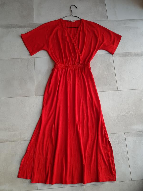 ефектне яскоаве міді плаття з стильними двома розрізами по бокам знизу, гарне деколь на запах та спущеною лінією плеча ; зручна резинка на таліїї. Загал довжина 120 см