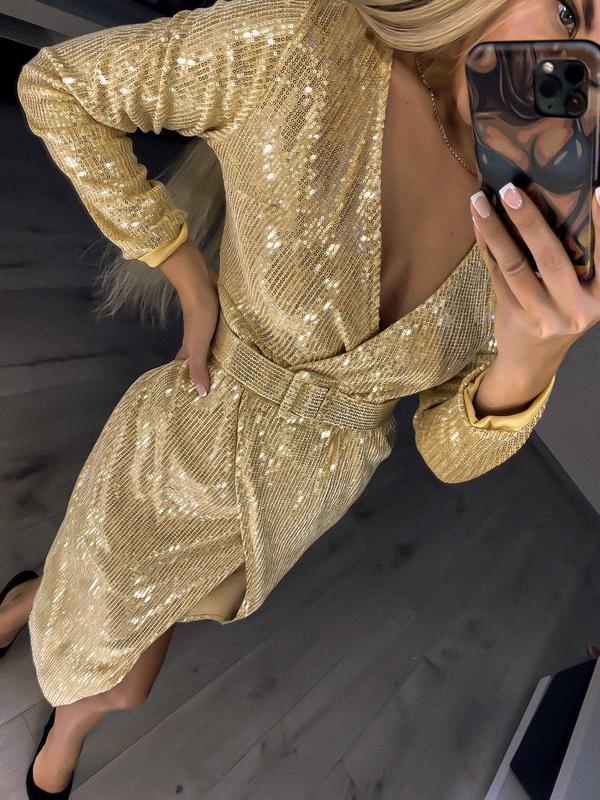 ❤️🔥 Нова колекція суконь ❤️🔥 Неймовірна сукня міді на запах, розшита дрібною паєткою Запах на кнопці Пояс в комплекті Сукня на підкладці Колір: золотий S, М, L Довжина 116 cm Рукав 55