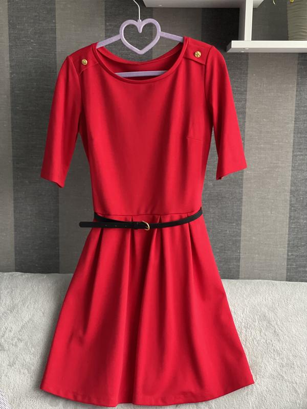 Червона сукня в розмірі М з ремінцем чорного кольору. Одягалась один раз. Загальна довжина 85 см, до талії 39 см. Напівобхват грудей - 44 см. Напіобхват талії - 36 см.