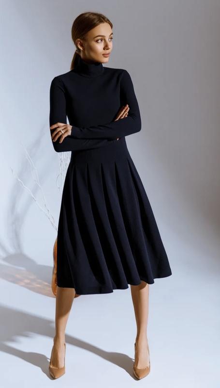 Розкльошена сукня-міді ,темно-синього відтінку: комір-стійка, довгий рукав, талія з відрізною плісованою спідницею в широку складку. МАТЕРІАЛ ТА СКЛАД: Трикотажне полотно машинної в'язки, в основі якого волокна натурального походження. Склад:Полиестер 97%, Спандекс 3% Матеріал:трикотаж. ДОГЛЯД: Ручне або щадне машинне прання при температурі, не перевищує 30 градусів за Цельсієм. Хімчистка та машинне сушіння заборонені. Прасувати при максимальній температурі 110 градусів.