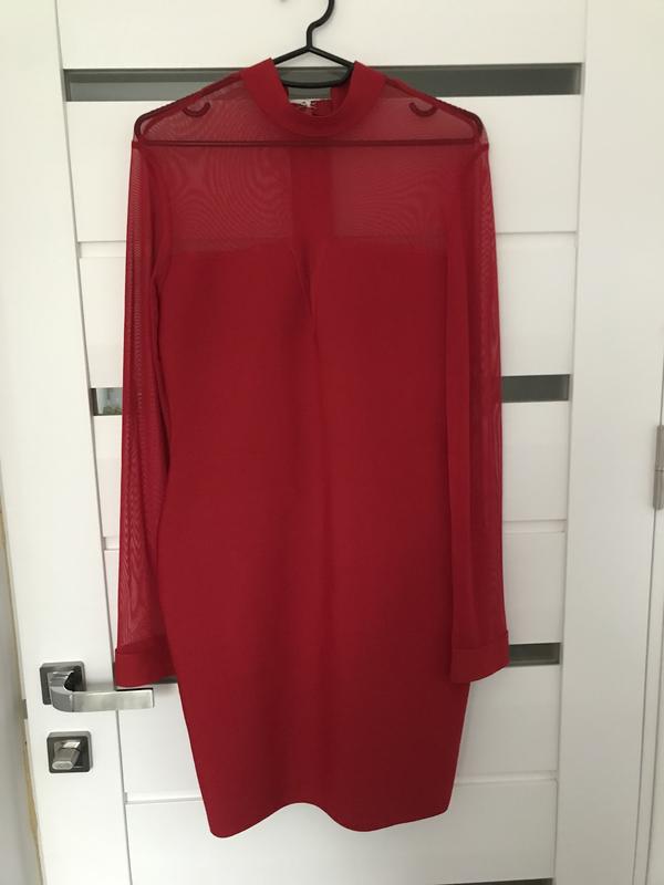 Приталена червона сукня, на змійці Спереду де груди і ззаду йде сіточка, рукава теж Дуже стильно виглядає По фігурці седить ідеально