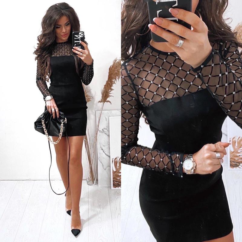 Сукня арт. sat. 5185 Размеры: S, M, L, XL Ткань: турецкий замш на дайвинге, верх нарядная стрейчевая сеточка Цвет: черный Длина изделия 90 см, рукав 62 см. По спинке потайная молния. Супер качество.ск1.Не нажимайте на кнопку Купит, технические проблемы подписывайтесь..жду)
