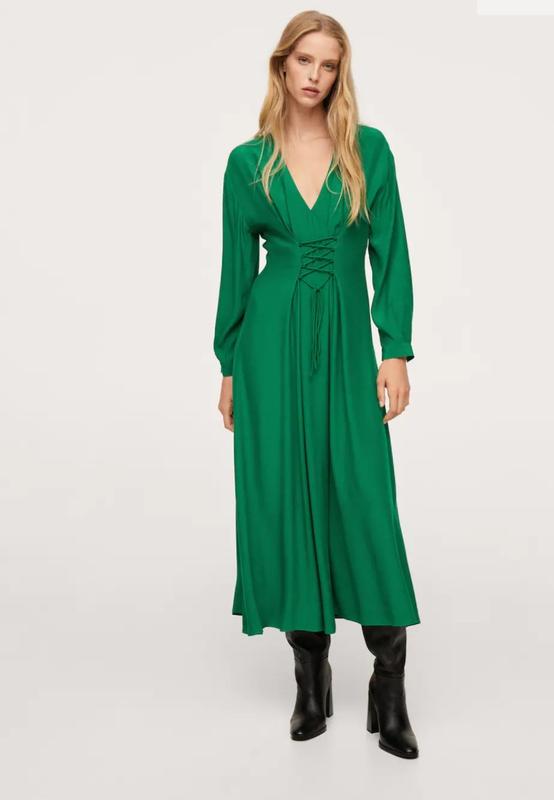 Струменева тканина. Модель із відступом. Довжина до коліна. Розширювана модель. Відкладний V-подібний виріз, довгі рукави з манжетами на ґудзиках. Регульований шнурок на талії. 100% віскоза