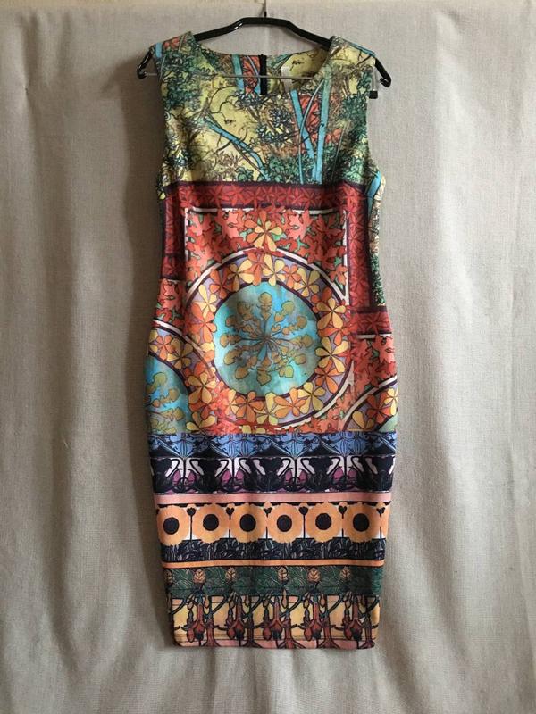 Фантазійний рослинний принт в радісних кольорах Трикотажна тканина щільна, не просвічується, еластична Плаття без підкладки Силует приталений по фігурі Крій - цільнокроєне, без рукавів Застібка на довгу блискавку ззаду Довжина 98 см, плечі 36 см ПОГ 44 см, ПОТ 36 см ПОБ 46 см, ПО низу 44 см