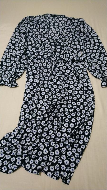 Шикарное платье миди длинный рукав цветочный принт по спинке по талии вшита резиночка подрезы под грудью небольшой вырез с оборкой ПОГ 47 ПОТ 38 тянется до 41 ПЛЕЧИ 37 РУК 66 БЕДРА 55 ДЛИНА 122 расстояние до линии талии 35,5
