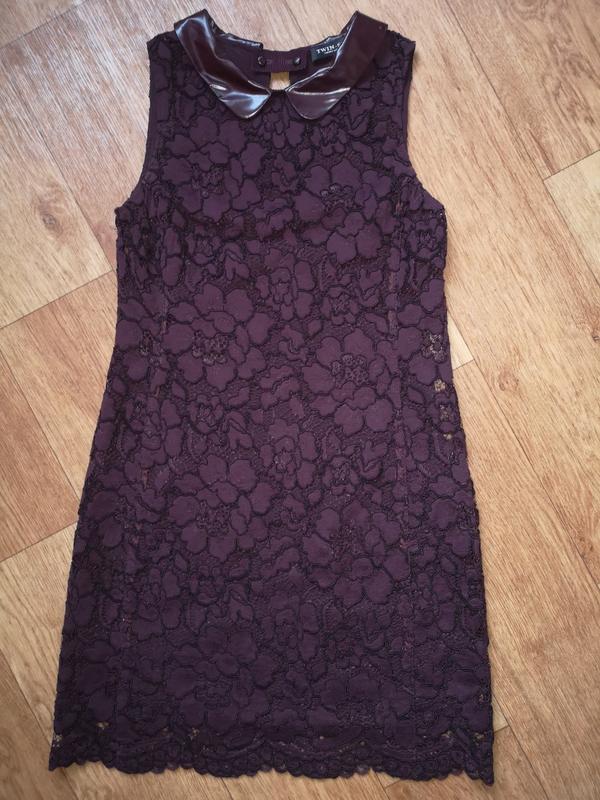 Елегантне плаття довжини міні від італійського бренда Twinset зроблене з мережива благородного бордового відтінку. Виріб без рукавів і обтислий кроєм, що підкреслює плавні та жіночні вигини фігури. Романтичність образу надають оригінально оформлений комірець зі штучної шкіри. Склад: 50% бавовна, 30% віскоза, 20% нейлон. Розмір XS. Стан ідеальний.