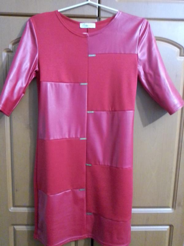 красивое платье с кожзам вставками, идеальное состояние, надевалось пару раз, 42 размер, длина 88, пог 37, пот 40,, материал чуть тянется, рукав полуобхват 12 см, цвет реальный на последних фото.