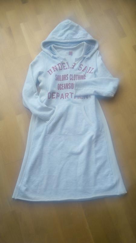 Стильне плаття - худі з капюшоном, трикотажне,світлого кольору. Можна стилізувати з чобітьми,кросівками,кедами,челсі тощо... довжина 96 см ширина спинки до 38 см