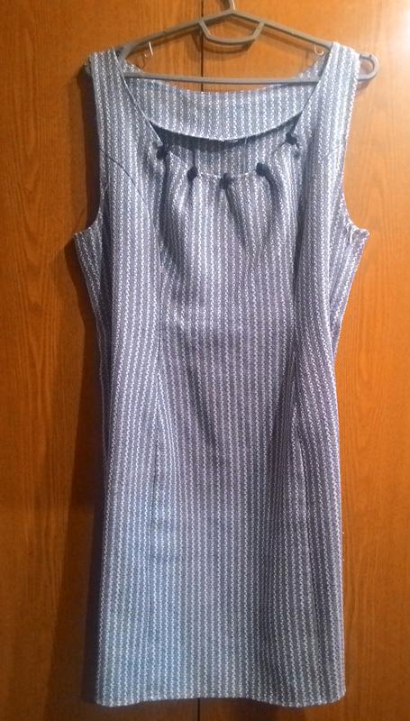Платье идеально подойдет для офиса. Удобное и деловое. Декольте украшено камнями. Длина до колена. Застежка на потайную молнию.