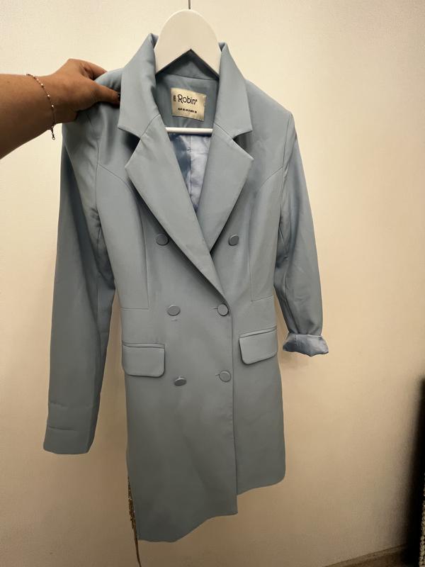 Ніжно голубе плаття піджак ( на фото коляр жовтить ) , розмір С-М З боку має виріз на ножиці Ціна 450 грн