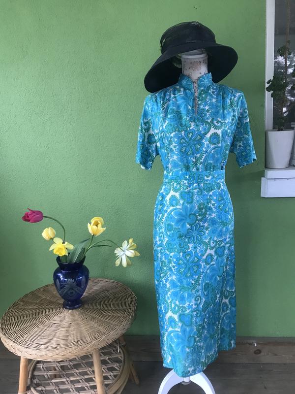 Красивое элегантное платье длиной миди шитое по индивидуальному заказу. Шёлк высочайшего качества. Платье без подкладки, по бокам-разрезы, застежка-молния по спинке. Поясок шириной 4 см. Очень качественная работа. Замеры: длина -117 см, ПОГ-47 см, ПОТ-41 см, ПОБ-48 см.
