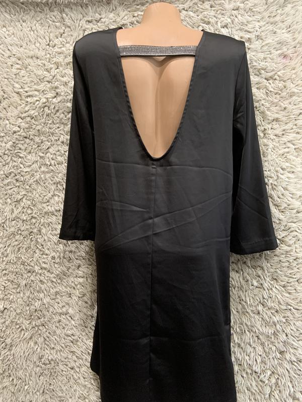 Оригінальна чьорна атласна сукня. На спині виріз, прикрашена стразами. Довжина 80 см Рукав 46 см ПОГ 46 см
