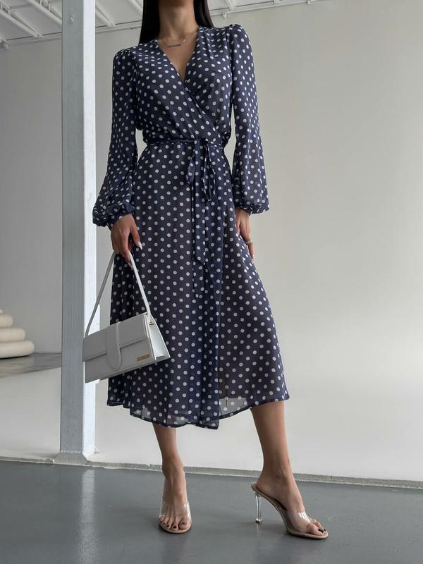 Сукня на запах в горох з декольте поясом міді синя чорна шифон