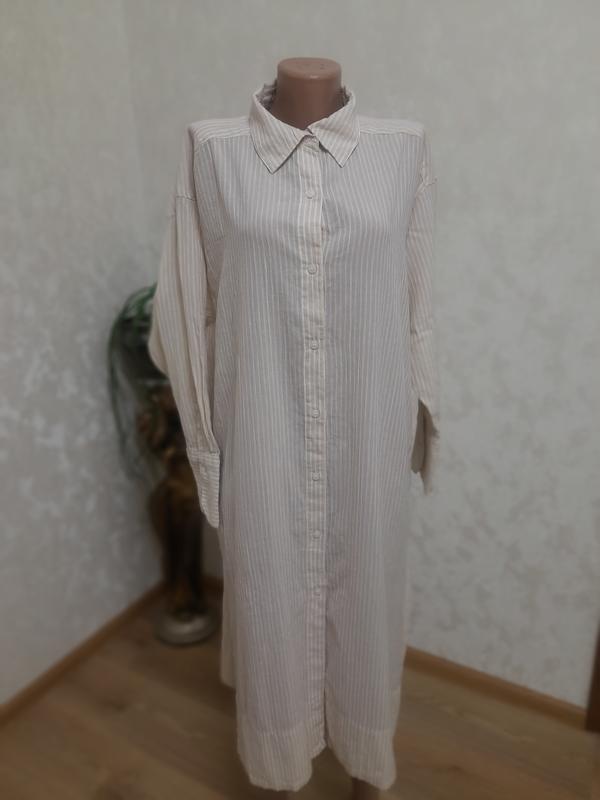 Стильное прямое платье рубашка в полоску.Размер S подойдет и на M- L По бокам длинные разрезы. По низу широкий подгиб что придает форму и утяжеляет к низу Замеры: ПП 55 ПГ 66 ПТ 66 Низ 69 Разрезы 37 Длина 117 Рукав 54