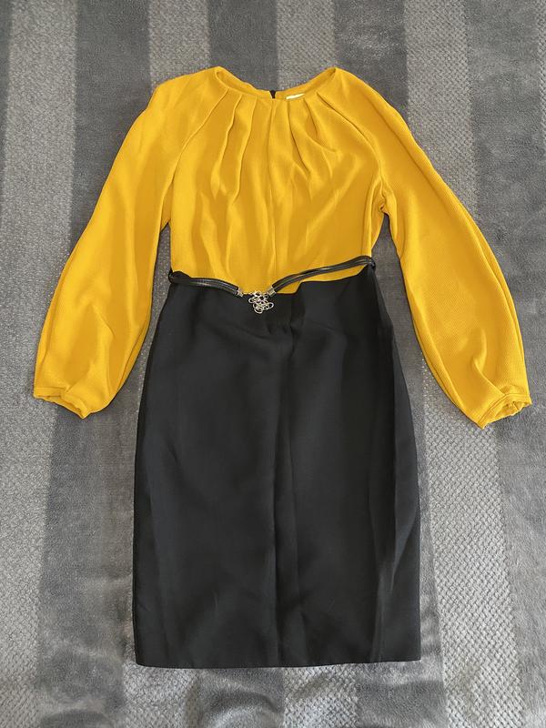 Чудова сукня на весну/осінь. Бренд Be TRIA. Можна вдягнути на роботу в офіс і на вечерю в ресторан. Середня довжина, вільний рукав, гарне поєднання кольорів - теплий жовтий (не яскравий) з чорним Розмір 42/46, М Повна довжина від плечей до низу - 101 см Виглядає як нова У комплекті до неї є ремінь