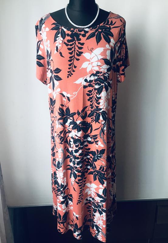 Сукня відомого бренду, приємна на дотик тканина - 95% віскоз, 5% еластан, ефектний принт, лаконічний перед, рукав короткий,родзинка- цікавй виріз на спині, стан і фасон максимально показано на фото, розмір указано 14, орієнтуйтеся по замірах. Заміри: довж від плеча до низу-105, пог під проймами -54, по грудях-53, пот-57, по стегон-63, по пройми рукава-26,5, по низу-15, довж рукава- 17, шплечей-40, тканина тягнеться, заміри зроблено в спокійному стані , якщо якийсь важливий переміряю, повернення не має,відповім на всі питання, відправлю зручною вам поштою після оплати на картку Приват чи Моно, з безпечною оплатою і накладним платежем не працюю, читайте розділ « про мене»
